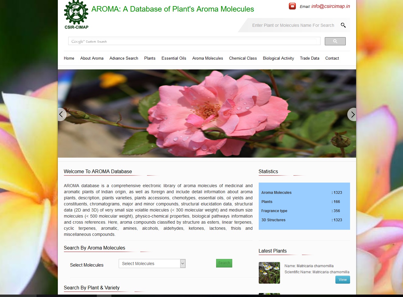 AROMA database (http://bioinfo.cimap.res.in/aroma/) is a comprehensive electronic library of aroma molecules of medicinal and aromatic plants of Indian origin, as well as foreign and include detail information about aroma plants, description, plants varieties, plants accessions, chemotypes, essential oils, oil yields and constituents, chromatograms, major and minor compounds, structural elucidation data, structural data (2D and 3D) of very small size volatile molecules (< 300 molecular weight) and medium size molecules (< 500 molecular weight), physico-chemical properties, biological pathways information and cross references. Here, aroma compounds classified by structure as esters, linear terpenes, cyclic terpenes, aromatic, amines, alcohols, aldehydes, ketones, lactones, thiols and miscellaneous compounds. Publication: Kumar Y, Prakash O, Tripathi H, Tandon S, Gupta MM, Rahman LU, Lal RK, Semwal M, Darokar MP, Khan F. AromaDb: A Database of Medicinal and Aromatic Plant's Aroma Molecules With Phytochemistry and Therapeutic Potentials. Frontiers in plant science. 2018;9. (PMID: 30150996) |