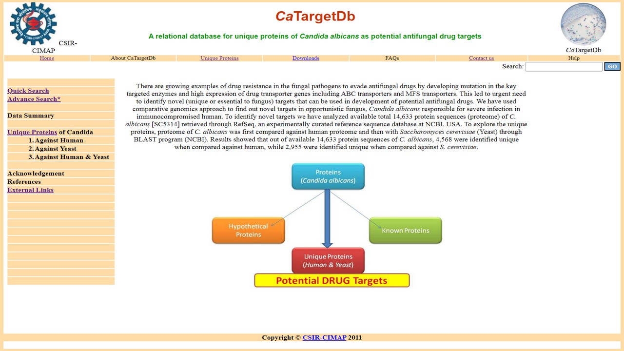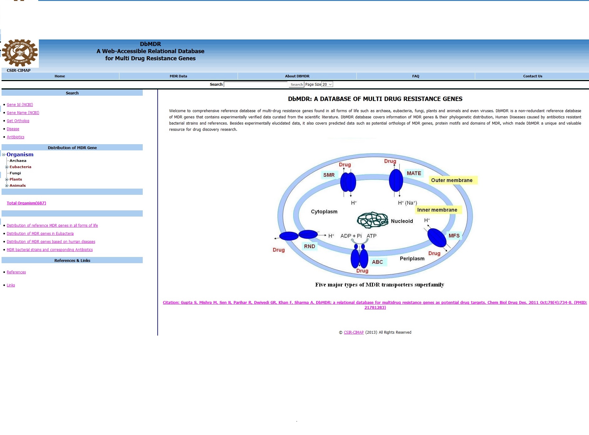 DbMDR (http://bioinfo.cimap.res.in/dbmdr/index.aspx).A comprehensive reference database of multi-drug resistance genes found in all forms of life such as archaea, eubacteria, fungi, plants and animals and even viruses. DbMDR is a non-redundant reference database of MDR genes that contains experimentally verified data curated from the scientific literature. DbMDR database covers information of MDR genes & their phylogenetic distribution, Human Diseases caused by antibiotics resistant bacterial strains and references. Besides experimentally elucidated data, it also covers predicted data such as potential orthologs of MDR genes, protein motifs and domains of MDR, which made DbMDR a unique and valuable resource for drug discovery research. Publication: Gupta S, Mishra M, Sen N, Parihar R, Dwivedi GR, Khan F, Sharma A. DbMDR: a relational database for multidrug resistance genes as potential drug targets. Chem Biol Drug Des. 2011 Oct;78(4):734-8. (PMID: 21781283) |