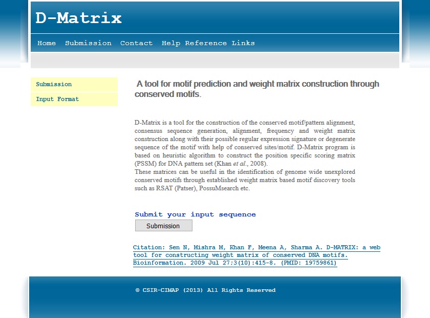 D-Matrix (http://bioinfo.cimap.res.in/dmatrix/). D-Matrix is a tool for the construction of the conserved motif/pattern alignment, consensus sequence generation, alignment, frequency and weight matrix construction along with their possible regular expression signature or degenerate sequence of the motif with help of conserved sites/motif. D-Matrix program is based on heuristic algorithm to construct the position specific scoring matrix (PSSM) for DNA pattern set (Khan et al., 2008). These matrices can be useful in the identification of genome wide unexplored conserved motifs through established weight matrix based motif discovery tools such as RSAT (Patser), PossuMsearch etc. Publication: Sen N, Mishra M, Khan F, Meena A, Sharma A. D-MATRIX: a web tool for constructing weight matrix of conserved DNA motifs. Bioinformation. 2009 Jul 27;3(10):415-8. (PMID: 19759861)